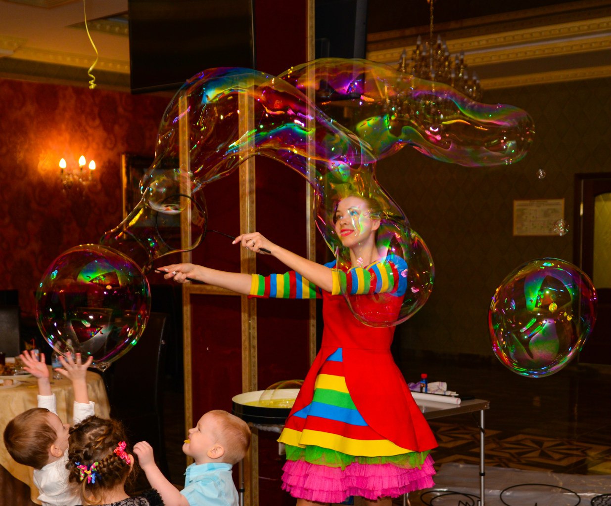 Если Вы до сих пор думаете, что шоу гигантских мыльных пузырей интересно только детям, то я иду к вам! Вы получите красивое и «вкусное» представление, которое зарядит вас и ваших гостей позитивом и энергией на весь вечер!